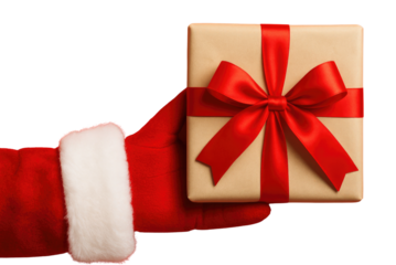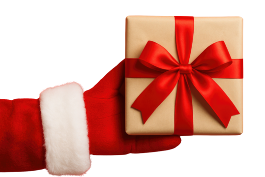 Santa Claus hand in red suit and white glove holding a brown gift box with red ribbon and bow on black background isolated on a transparent background