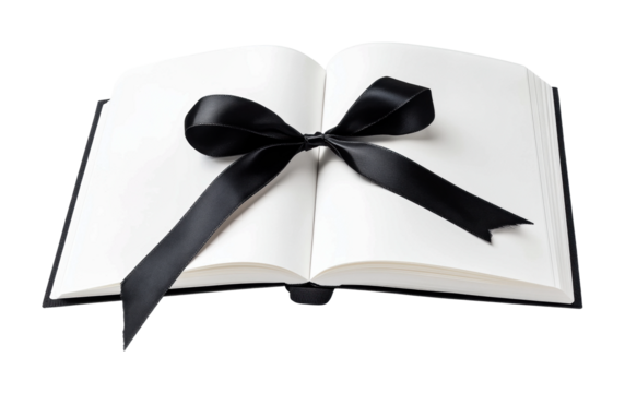 Open book with black ribbon bow on white pages, cut out