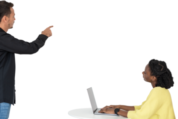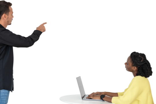Silhouette of a man presenting in front of an open laptop computer on white background with presentation and technology and business