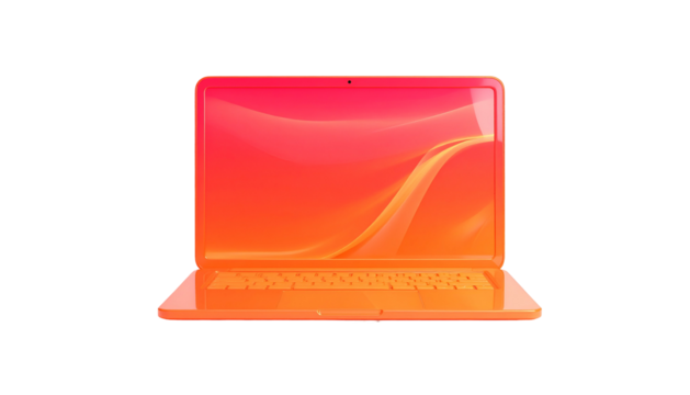 A vibrant, neon-orange laptop with an illuminated screen, set against a black backdrop
