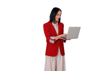Businesswoman standing, smiling, typing on laptop, presenting professional success and remote work concept on transparent background