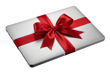 A sleek silver laptop wrapped with a vibrant red ribbon and bow, transparent background