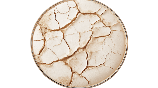Pressed face powder texture with small cracks and soft beige color, detailed beauty product close-up, isolated on white background, PNG format