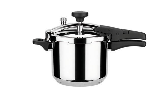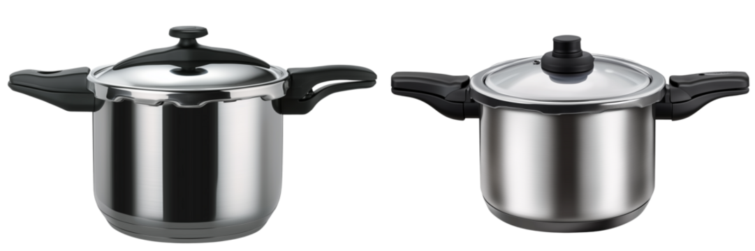 A stainless steel pressure cooker isolated on transparent background, showcasing its sleek design and modern elegance for efficient and safe cooking in the kitchen