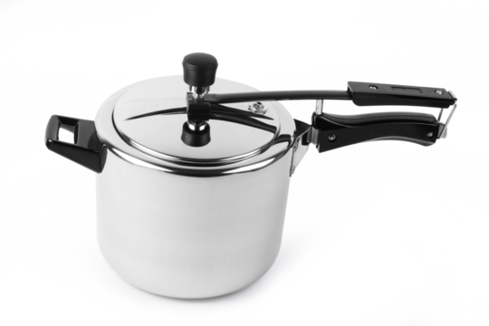 A stainless steel pressure cooker, with a black handle, is highlighted against a dark background.