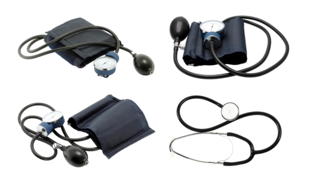 Electronic digital tonometer, device for measuring blood pressure, isolated on a transparent background. The display shows 120/80.