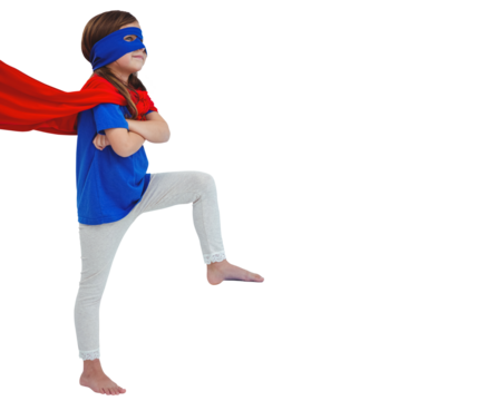Transparent young girl in red cape pretending superhero