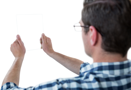 Man pretending to hold invisible object in transparent background