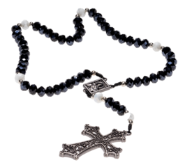 Terço com crucifixo de metal e pedras de cristal facetado de cor preto. Formato de arquivo png fundo transparente.