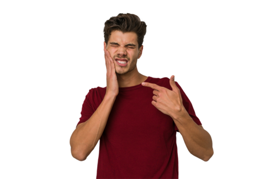 Young caucasian handsome man isolated having a strong teeth pain, molar ache.