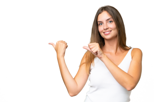 Smiling woman in white tank top pointing on transparent background