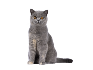 Adorable young blue tortie British Shorthair cat, sitting up side ways but  facing front. Looking towards camera with pretty orange eyes. Isolated cutout on a transparent background.