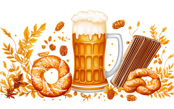 Holiday invitation artwork showcasing German beer festival elements for Oktoberfest party and festive gatherings isolated on white background PNG