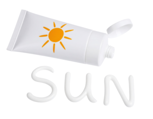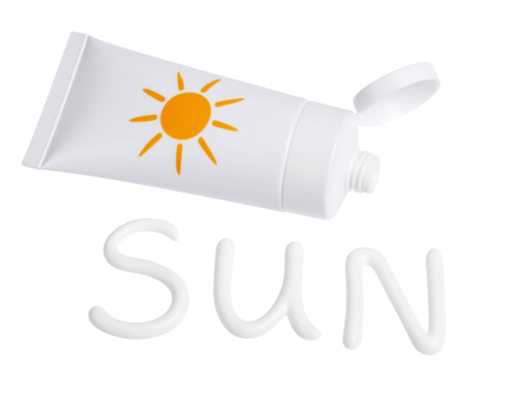 A tube of sunscreen with a sun design and the word "SUN" spelled out in cream.