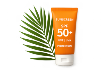 Sunscreen tube spf 50+ uv protection with tropical palm leaf