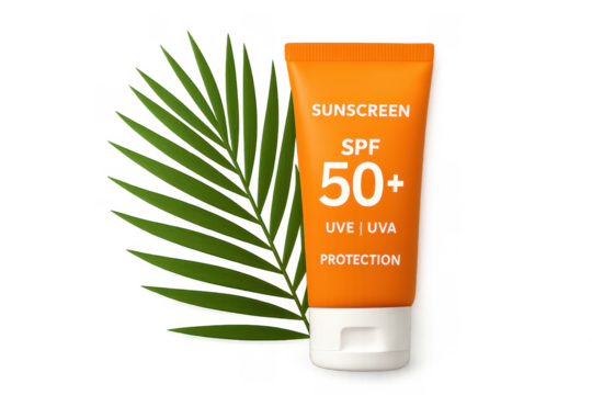 Orange plastic sunscreen bottle with spf 50 very high protection against uva and uvb sun rays, isolated on transparent background