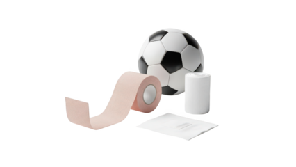 A roll of athletic tape, a soccer ball, and medical supplies on transparent background
