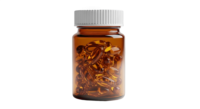 Amber container filled with golden capsules showcasing vitamins or supplements, perfect for health, wellness, and nutrition themes, isolated on white background