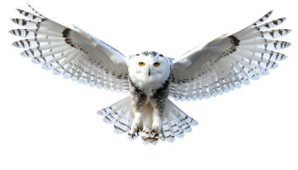 Majestic owl with wide wingspan, white plumage, and piercing yellow eyes, soaring toward the viewer