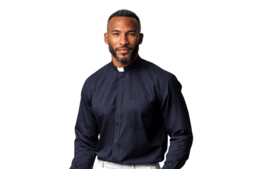 Male pastor in clerical clothing standing against a transparent background, representing faith, leadership, and spiritual guidance