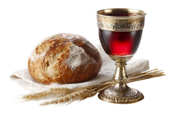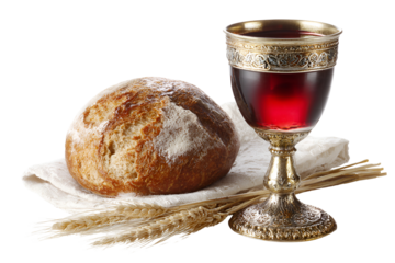 Communion elements of bread and wine in a goblet on a cloth isolated on transparent background