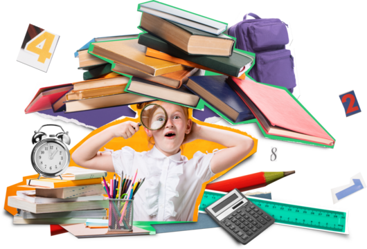 Abstract mixed media with schoolgirl examining books on transparent background. Concept of learning curiosity, research mindset, academic exploration and primary school education.