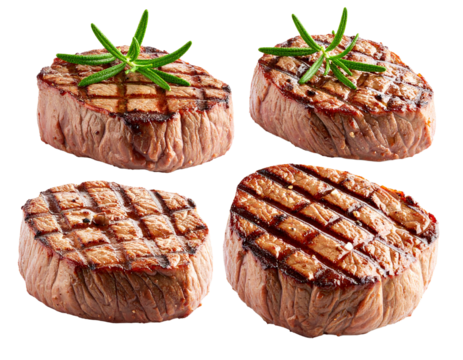 Juicy grilled beef steak with rosemary and peppercorns isolated on transparent background