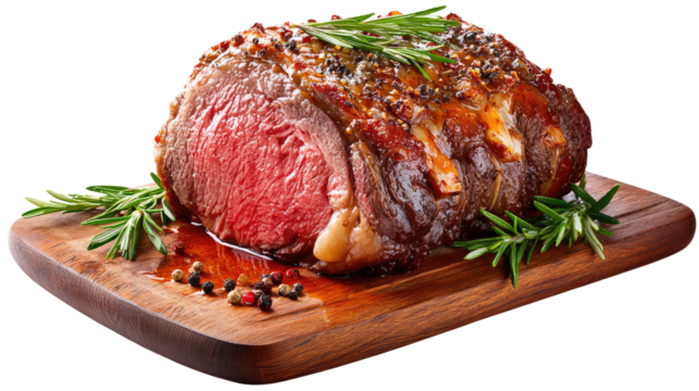 Roasted Prime Rib on Cutting Board: A mouthwatering close-up of a perfectly roasted prime rib, artfully presented on a wooden cutting board, garnished with rosemary and peppercorns.