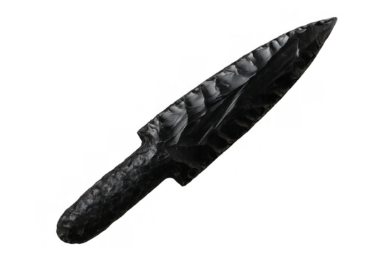 Obsidian knife with a finely knapped blade and handle, representing ancient craftsmanship, a prehistoric tool on a transparent background