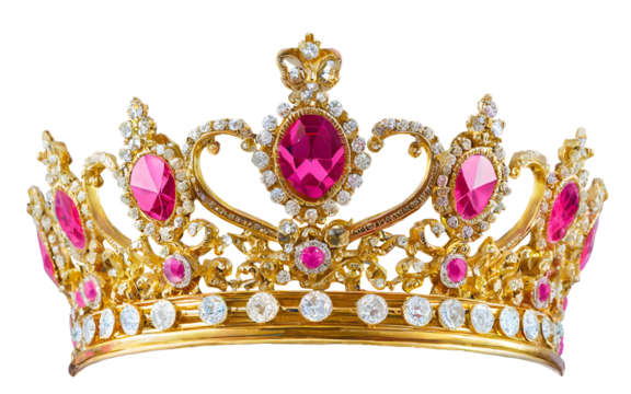 Royal gold crown with pink diamonds isolated on transparent background. Generative AI