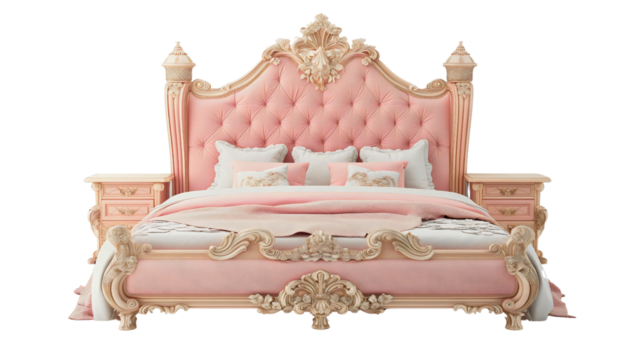 Luxury Victorian royal pink princess bed with white pillows, isolated object on transparent background