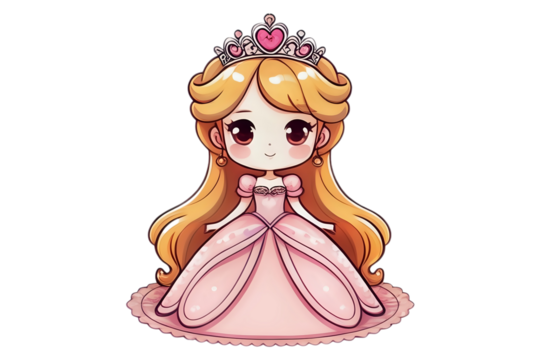 Cartoon princess in pink dress with crown on transparent background