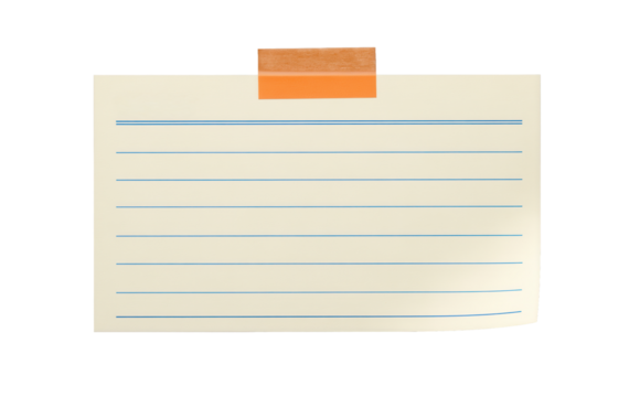 Lined index card taped at the top with blank ruled paper isolated for handwriting notes and checklist copy, stationery memo layout for business messaging and classroom flashcard text