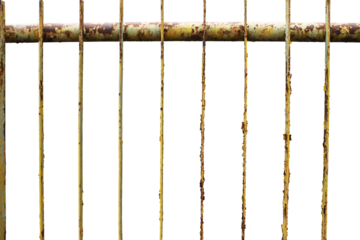 A metal prison cell door with bars isolated on transparent background. A metal door with bars and a lock is shown. The bars are rusted and the lock is also rusted.