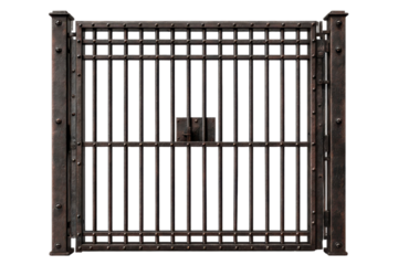 A metal prison cell door with bars isolated on transparent background. A metal door with bars and a lock is shown. The bars are rusted and the lock is also rusted.