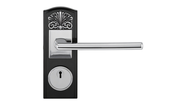 Elegant door lever handle with intricate filigree atop a sleek, black plate and keyhole on black background