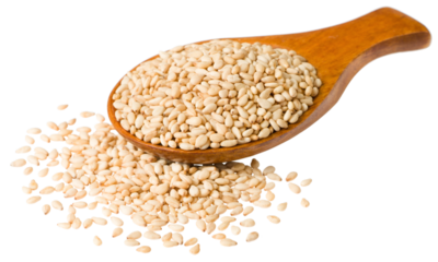 Roast white sesame seeds in the wooden spoon, isolated on white background.