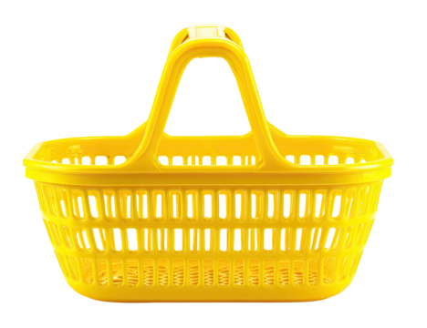 Bright yellow shopping basket with a handle, isolated on black background