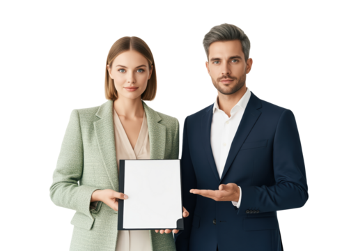 Document presentation by business partners holding a blank folder and pointing for signature, procurement approval and compliance paperwork use in contract negotiation and office filing