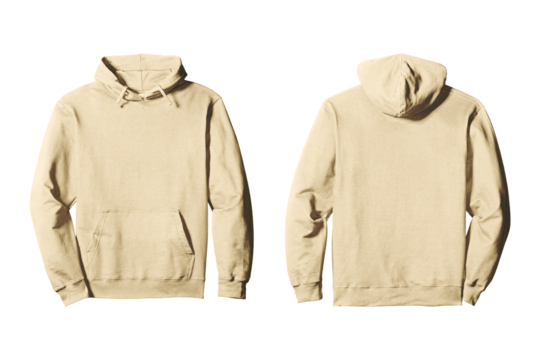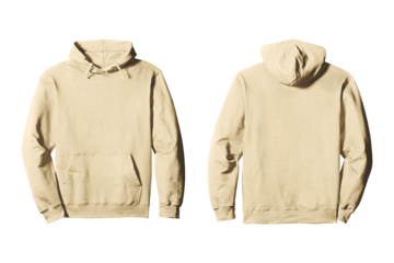 Front and back view of a plain white hoodie hanging on a clothes hanger on png transparency