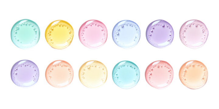 A visually appealing arrangement of colorful gel or liquid samples in pastel shades, ideal for beauty and cosmetic product showcases