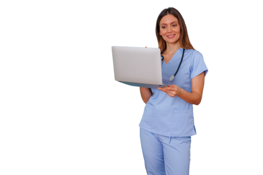 Female medical professional standing, holding an open laptop, smiling, discussing telemedicine and digital healthcare, transparent background
