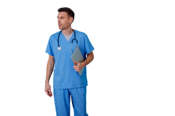 Male doctor in blue scrubs holding a digital tablet, healthcare professional looking away on transparent background