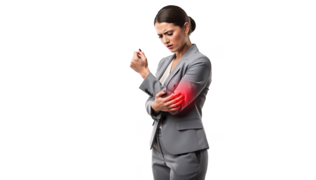Female professional in business attire showing elbow inflammation and grimace of discomfort isolated on white background symbolizing repetitive strain injury.