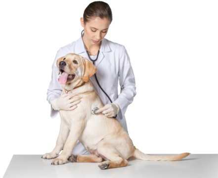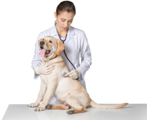 Caucasian vet carrying dog on transparent background for healthcare uses
