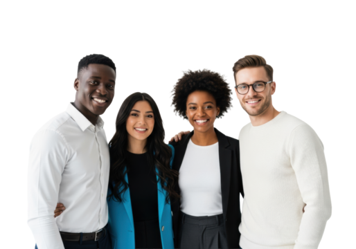Smiling businesswoman with diverse colleagues in collaborative meeting, transparent background