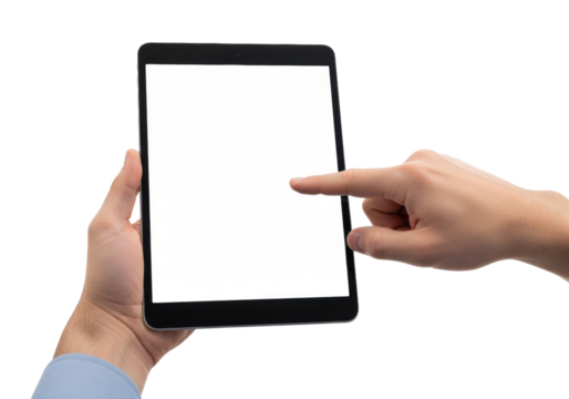 ultra photorealistic macro close-up of clean caucasian hands holding a black tablet with blank white screen, pointing index finger, isolated on transparent background. concept for digital device
