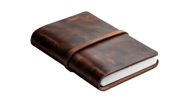 Brown leather-bound notebook with strap closure and visible stitching—smooth, professional, and ideal for journaling, planning, or business note-taking