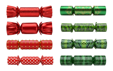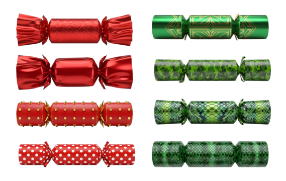 A collection of festive holiday crackers in red and green designs featuring geometric patterns polka dots and textured surfaces displayed in a professional lifestyle setting for