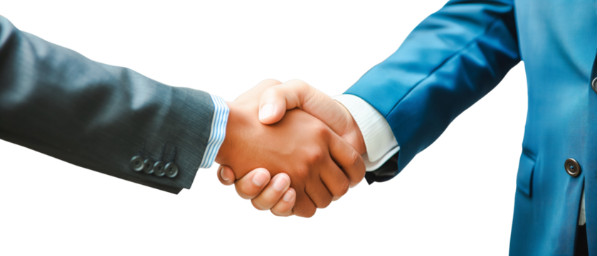 Closeup of two people shaking hands, wearing formal suits, isolated on a white background. Represents teamwork, agreement, and partnership. Ai generative